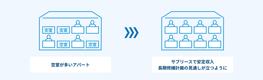 当社では、オーナー様が最も不安を感じていた「空室による収入の不安定さ」に対して、物件を一括で借り上げるサブリース方式をご提案しました。これにより、空室が発生しても毎月一定額の賃料が保証され、キャッシュフローが安定。運営のストレスから解放されました。