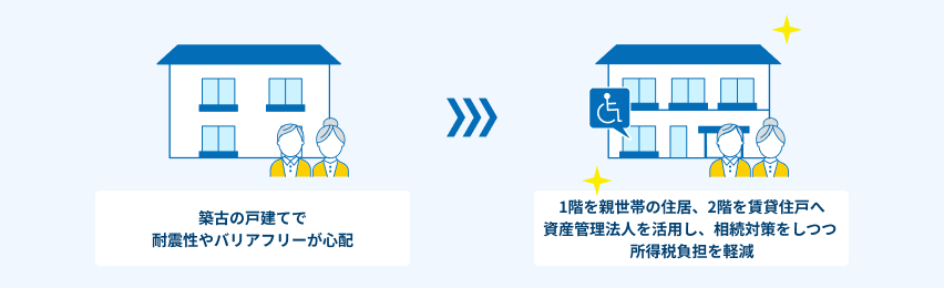 そこで、築古の戸建てを取り壊し、1階を親世帯の住居、2階を賃貸住戸とする「賃貸併用アパート」へと建て替えることをご提案。高齢な親が安心して暮らせる住居を確保しつつ、賃貸収入も得られることになります。