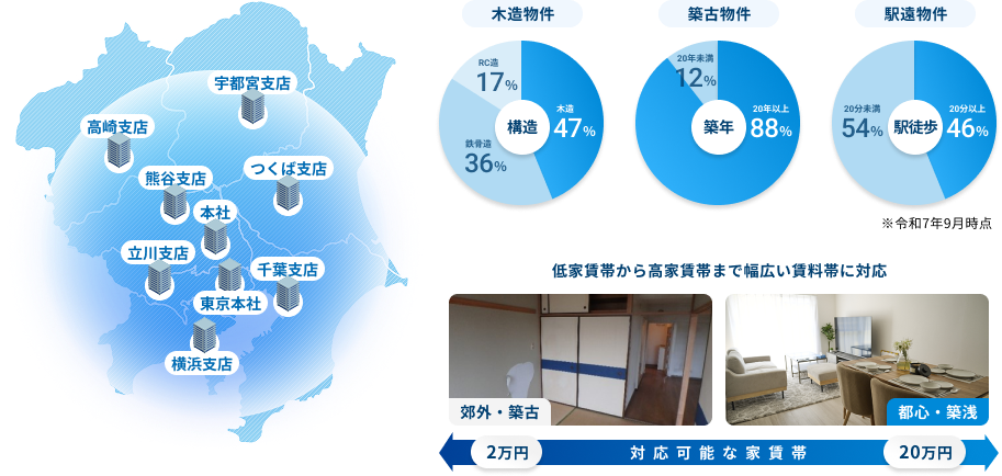 私たちが管理する約33,000戸の物件は、平均築年数30年以上、立地も東京都心に限らず、神奈川・千葉・埼玉・北関東と、関東全域の郊外にも広がっています。