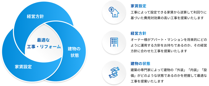 一級建築士やリノベーションプランナーといった専門家が建物・設備・内外装など物件の状態を診断。長期的に建物を維持保全するための大規模修繕工事や、入居者様のニーズやエリア特性を考慮した内装リフォームなど、オーナー様にとって最適な工事内容をプランニングします。工事施工後も賃貸管理を通じて、長期にわたりオーナー様が安心して賃貸経営を続けられるよう、建物を守り続けます。