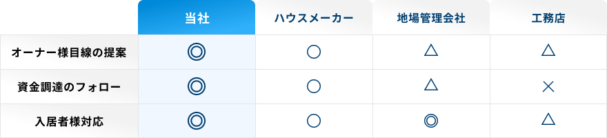 収益不動産の工事・リフォームは、ただお金をかければよいというものではありません。当社は20年間にわたり売買・管理を通じてオーナー様の収支に寄り添ってきたからこそ、費用対効果にこだわった工事・リフォームのノウハウがあります。物件の状態、お客様の運用方針、工事後の家賃設定などあらゆる点を考慮して、本当に必要な工事だけをご提案します。工事・リフォームを実施しても入居付けや賃料アップといった効果を得ることが難しいと判断すれば、施工自体をおすすめしない場合もあります。